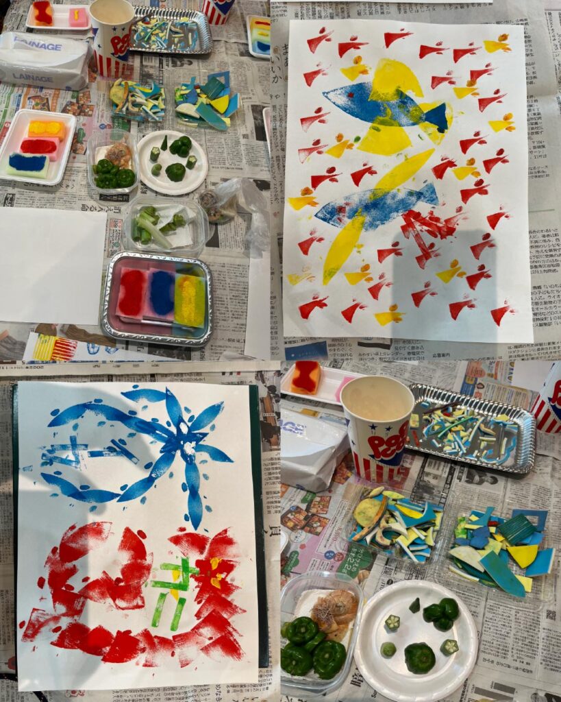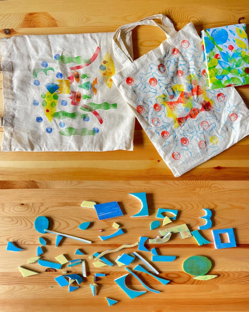 色々な形をしたゴムスタンプを使って、自分だけのオリジナルの「図書バッグ」を作ります!いろんなカラースポンジにゴムスタンプをピタピタと色をつけて、まずは下書きとして紙に完成予想図を作ります。