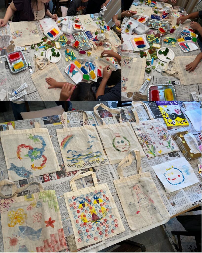 完成予想図ができたらいよいよ本番です!トートバッグにペタペタスタンプをして「世界でオンリーワンの図書バッグが完成!」メルヘンハウスや図書館などでご機嫌な図書バッグに絵本をいれる、子どもたちの新たな楽しみが待っています!