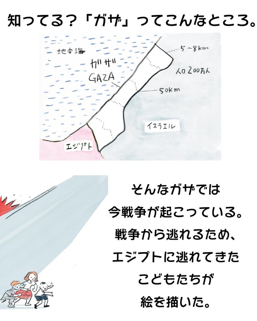 ガザ地区での過酷な状況を逃れてエジプトに避難している子どもたちの絵が、ある日渋谷区の子どもたちのもとに届きます。